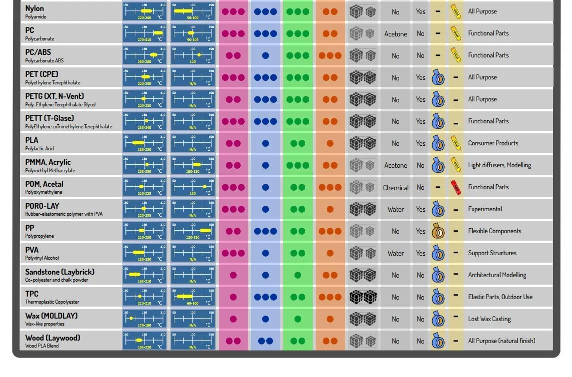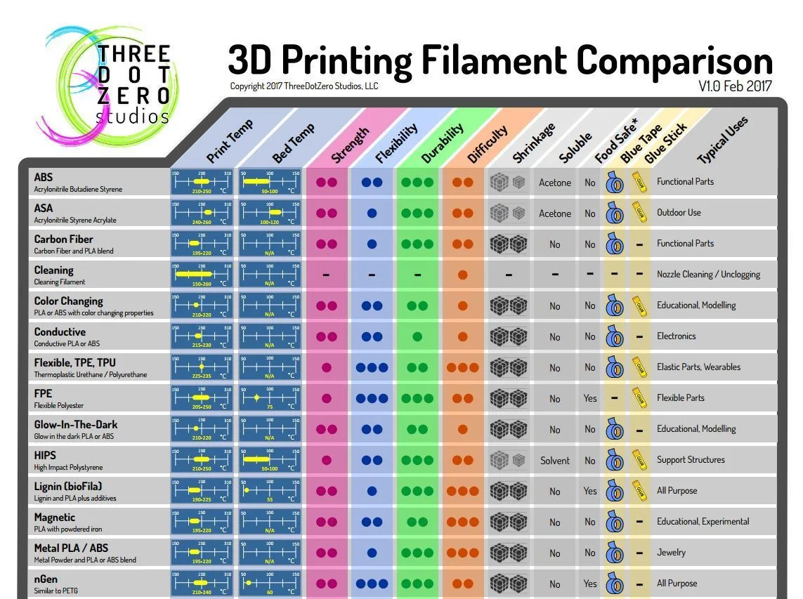 위 표에는 없는 eSun PLA+ 모델은 PETG와 PLA의 장점을 모아놓은 인기 많은 필라멘트입니다. PLA보다 매우 단단하며, 가공이 쉽고, 수축이 없으며, 주방용품으로도 안전합니다.