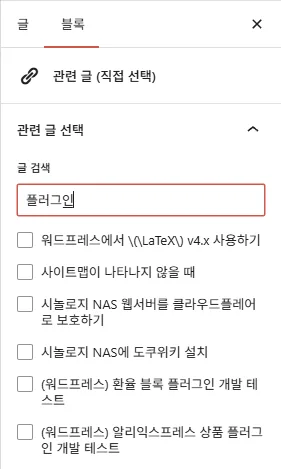 본문 편집기의 구텐부르크 블록 추가에서 관련 글 블록을 선택하면