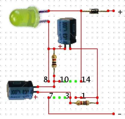 위 회로도의 아래쪽 커패시터 +와 전원 -에 LED를 연결하면 번갈아가면서 깜빡이게 됩니다.