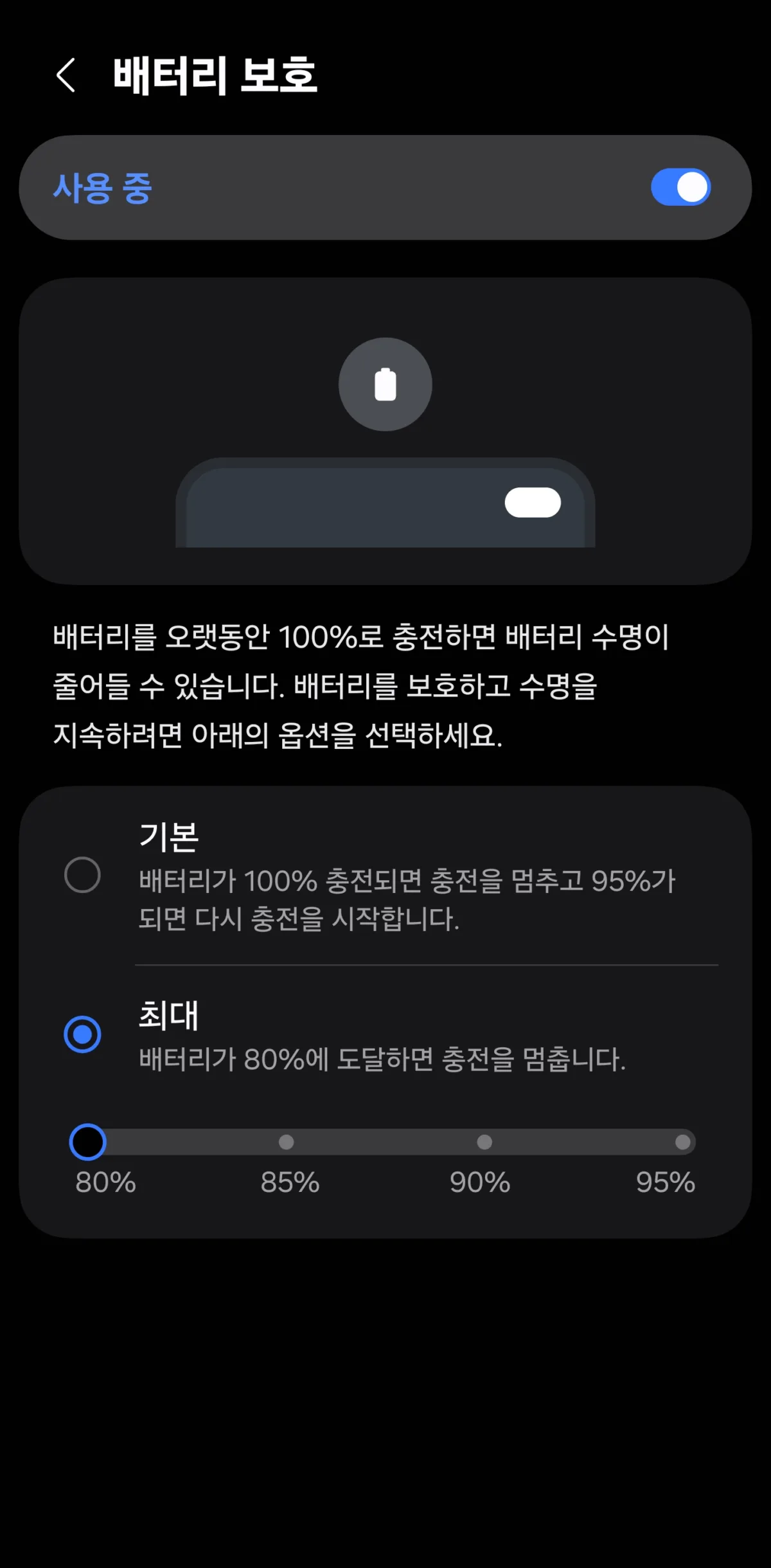 배터리 보호 사용 설정 후, 최대 항목을 선택하고 80%를 선택하면 됩니다.